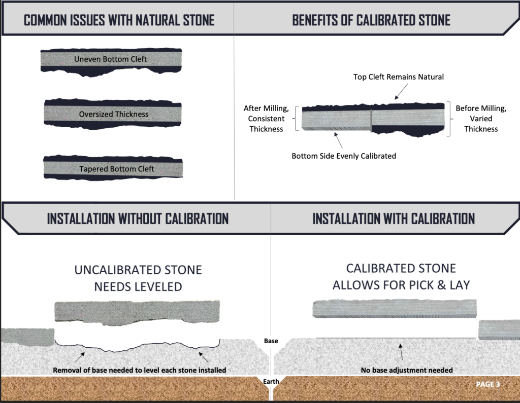 While natural stone has its own appeal, setting it can be a very time-consuming, and tedious process. Getting natural stone to lay flat and even takes a highly skilled mason, and even then, it will never match the finished result of calibrated stone. Common issues with natural stone include an uneven bottom clef, oversized thickness, and tapered bottom clefts. A calibrated stone has a flat bottom and even thickness making it much easier to work with. This allows you to save tons of time and money on your overall project. Uncalibrated stone needs to be leveled and depending on the base underneath, can be more prone to issues later on.